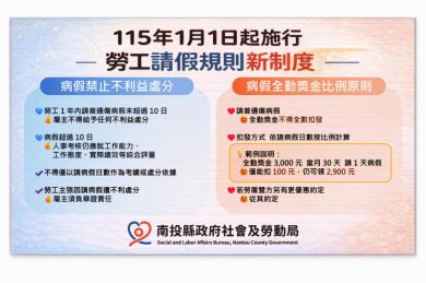 為了讓勞工敢請病假,南投縣政府社會及勞動局表示,勞動部已修正《勞工請假規則》,並於115年1月1日起施行,強化病假權益保障,新增「請病假禁止不利處分」及「明確請病假全勤獎金比例原則」,此次修正制度,能讓勞工在需要休養治療時更有保障,更能安心請病假,不用擔心雇主隨意給予不利處分,且全勤獎金不會因此全無。