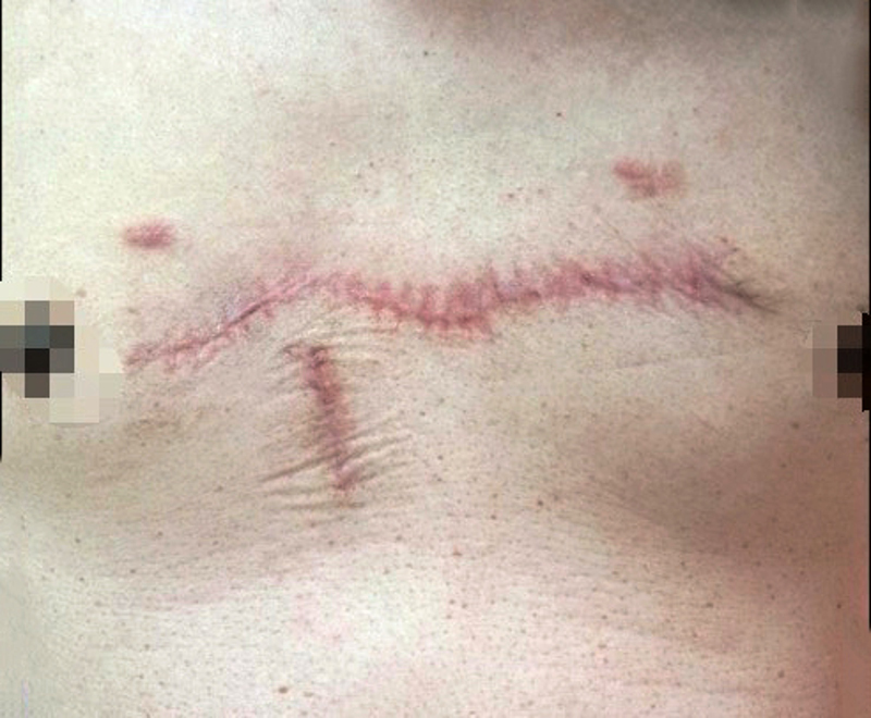 經2個月悉心治療,這名患者胸部疤痕明顯改善,不僅外觀恢復,重新找回自信。陳主任表示,外科手術結合原生基質膜/羊膜生長因子是一項安全且有效的治療選擇,能提升傷口正常癒合能力與患者生活品質。