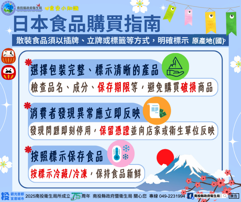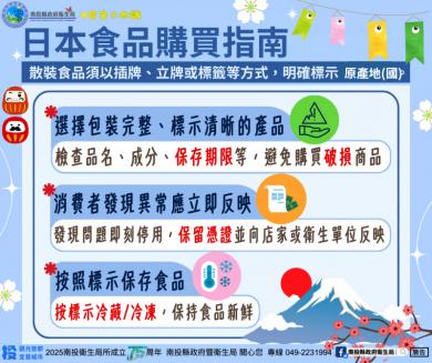衛生局提醒民眾購買前應檢視外包裝完整性及有無中文標示(如廠商名稱、電話、地址等),切勿購買標示不清或來路不明的食品。衛生局長陳南松強調,該局亦將持續加強稽查,並督導業者確實遵守相關規定,強化食品安全監管與資訊公開,與業者及民眾共同守護食品安全,打造安心、健康的消費環境。民眾如有食品衛生安全相關問題或消費疑義,可洽縣府衛生局服務專線049-2231994。