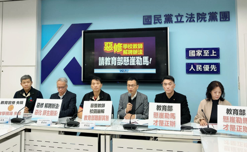 教育部1月12日修正《高級中等以下學校教師解聘不續聘停聘或資遣辦法》及《公立高級中等以下學校教師成績考核辦法》,並於1月14日正式上路。本次修法重點在於刪除匿名檢舉、新增輔佐人參與制度與程序保障。為此,國民黨團今(20)上午邀集全國教師工會聯合總會共同召開記者會,呼籲教育部懸崖勒馬,修法後更突顯教育官僚失職,造成教育現場失能,最後造成師生關係和校園環境嚴重失序。