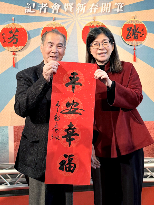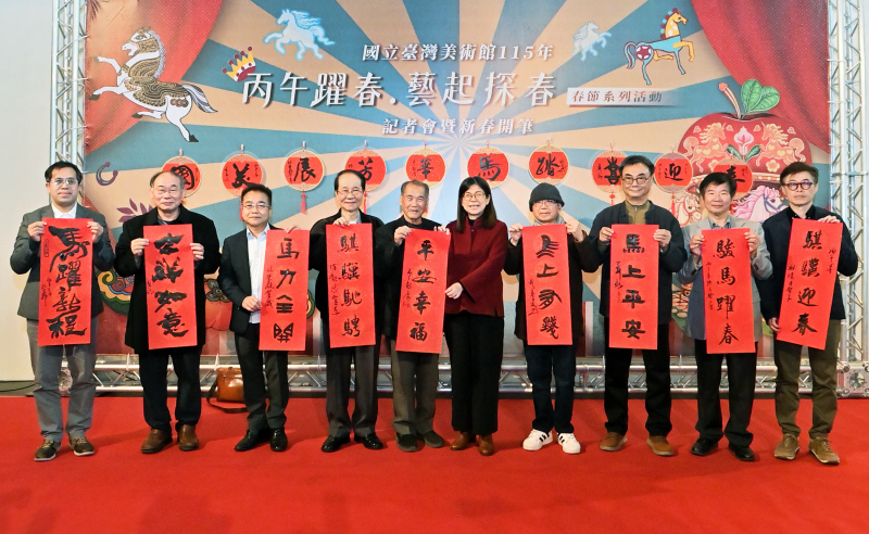 國美館今(24)日舉辦記者會暨新春開筆,由國美館長陳貺怡及李轂摩老師、施春茂老師、陳欽忠老師、林榮森老師、蕭世瓊老師、陳志聲老師、張志鴻老師、林俊臣老師、許志芳老師等9位知名書法家現場開筆祝福斗方,並現場揮毫祝賀春聯,傳遞馬年的期許祝福。當日並發送名家墨寶印製春聯,分別是國寶書畫家李轂摩老師、114年全國美術展書法類金牌獎許志芳老師之墨寶,供民眾限量索取。