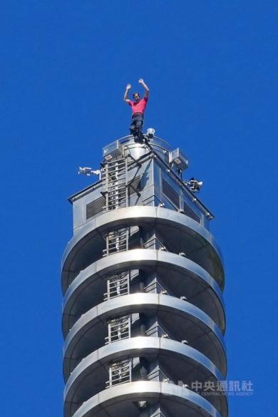 美國自由攀岩好手霍諾德25日徒手攀登台北101大樓,在成功攻頂後在塔尖揮手致意。中央社記者徐肇昌攝 115年1月25日