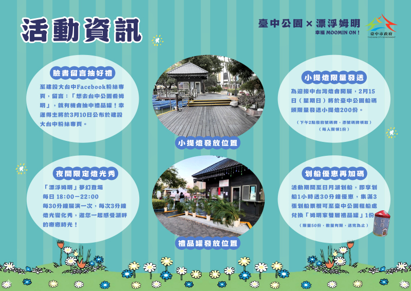 建設局說明,配合中台灣燈會,即日起至3月3日止,民眾至台中公園日月湖划船可享「划船1小時送30分鐘」限定優惠;集滿3張票根,還可至船碼頭兌換「姆明家雙層禮品罐」1份(限量50份,送完為止)。此外也推出臉書留言抽獎活動,只要至「建設大台中」Facebook粉絲專頁留言「想去台中公園看姆明」,即可參加限量200份禮品罐抽獎,幸運得主將於3月10日公布。邀請全台姆明粉絲踴躍參與,共同迎接馬年「幸福 MOOMIN ON!」。