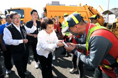 農曆春節將至,家家戶戶忙著除舊布新、迎接新年,也是清潔隊員一年當中最繁忙的時刻。市長盧秀燕今(14)日年假第一天特地前往南屯區清潔隊,親自向堅守崗位的第一線清潔人員表達關懷與感謝,並致贈加菜金新台幣20萬元,向環保英雄致上最誠摯謝意:「加油,謝謝,新年快樂!」