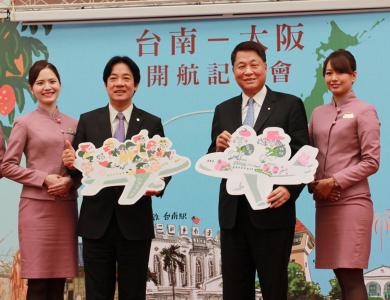 華航孫洪祥董事長(右二)與台南市賴清德市長(左二)共同宣布台南大阪即將於1028開航。