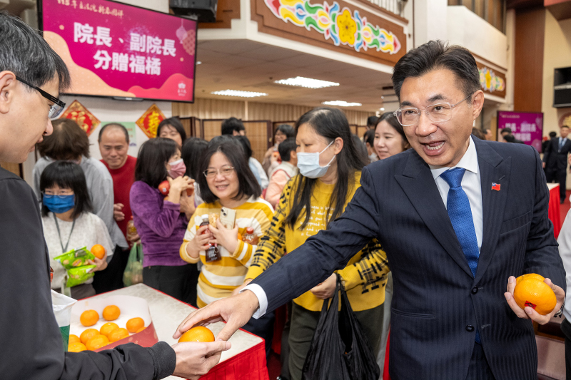 隨後,院長、副院長與在場委員及同仁互相拱手拜年,並以福圓茶舉杯祝賀新年,最後在院長及副院長分贈福橘予在場眾人的喜慶氣氛下,新春團拜活動圓滿完成。