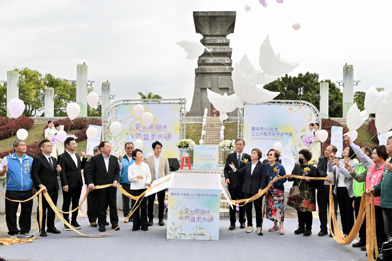 二二八事件屆滿79週年,台中市政府今(28)日在東區東峰公園二二八紀念碑前舉行和平紀念追思會,市長盧秀燕帶領民眾默哀致意,並在紀念碑前獻上鮮白百合,向受難者英靈表達追思與敬意。
