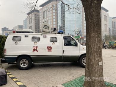 北京市區出現武警車、保安與公安。(中央社)