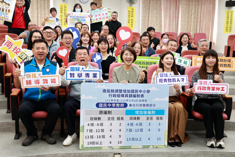南投縣長許淑華18日宣布一項重大教育政策,自115學年度(即8月1日起)起,擴大國中小學行政人員編制,預計每年增加約2,372萬元支出。這項措施將減輕教師兼任行政工作壓力,也讓教育回歸教學本質。