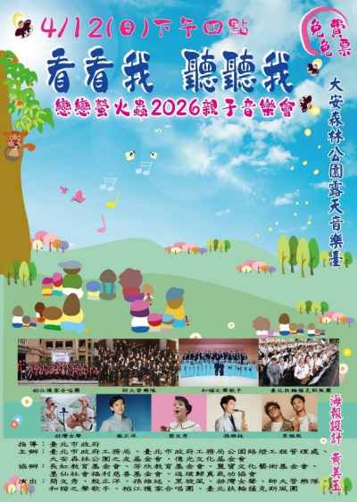 依照往例,我們保留最佳觀賞區近百個席位給失智老人基金會、心燈啟智教養院、愛維養護中心、博愛長照中心及輪椅族們…等,音樂會免費免票,大合唱後別急著離開,留下來參加賞螢導覽,並見證大安森林公園的自然生態及花團錦簇的春天!