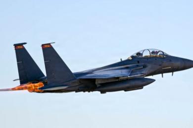 2026年3月16日,在「史詩之怒」(Operation Epic Fury)行動期間,一架美國空軍F-15E打擊鷹(F-15E Strike Eagle)從祕密地點起飛執行戰鬥任務。(美國空軍 / 法新社)