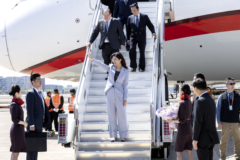 鄭麗文率領國民黨大陸訪問團今日上午搭乘上海航空FM852航班,11時30分由松山機場起飛,約下午1時15分抵達上海虹橋機場。睽違十年後再次有國民黨主席到訪中國大陸,陸方特別禮遇,航機滑行至停機坪後開機門下機,現場並有歡迎群眾獻花。