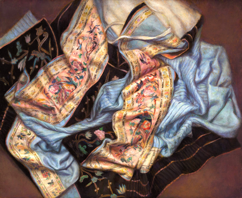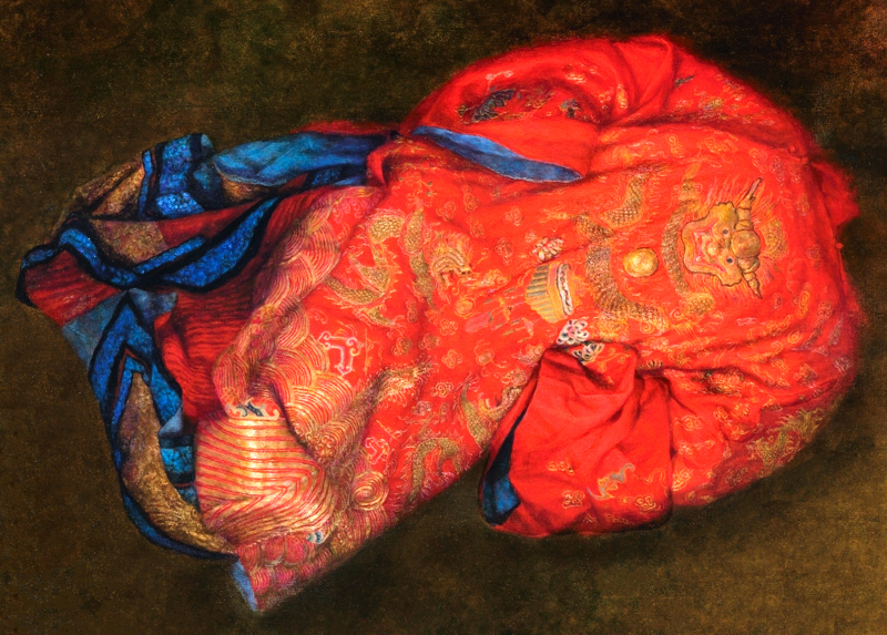 陳香伶去年二月底曾帶著作品「烈愛」遠渡重洋來到法國巴黎參加由法國文化部、法國國家博物館、巴黎市政府、四大藝術沙龍等單位共同發起的的國際年度藝術盛事「首都藝術展」。「烈愛」畫作,延續了她一貫以「清代刺繡絲綢」為符號的創作語彙,以極致細膩的寫實技法,探討現代女性在傳統與自我間的反思與覺醒,透過這件畫作勾勒女性在婚姻角色中的定位,繡面上象徵祝福與祈願的吉祥圖騰卻也隱涵傳統父權對女性的束縛。