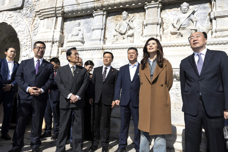 訪問團一行上午步入碧雲寺內所設的孫中山紀念堂,對紀念堂中的孫中山先生漢白玉全身塑像行三鞠躬禮,兩旁擺放的花圈緞帶上書寫「總理孫中山先生靈鑒」,落款「中國國民黨主席鄭麗文暨全體同志敬獻」。