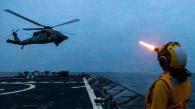 圖/美國海軍驅逐艦米利厄斯號3月25日在執行對伊朗作戰任務時,直升機在甲板起降。這類直升機將可在美軍封鎖荷姆茲海峽時,執行運兵登船的任務。路透社