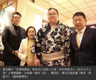 媒體人矢板明夫在臉書透露,4月25日,在日本東京両國國技館旁邊的居酒屋「花舞」辦了一場別開生面的活動——東白龍的台灣後援會成立。