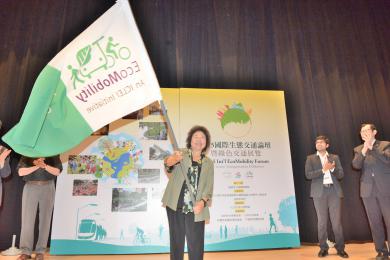(趙秀蘭 趙秀梅報導)2015國際生態交通論壇暨綠色交通展覽24日於高雄市立圖書總館8樓盛大開幕,高雄市長陳菊正式從上屆主辦韓國昌原市副市長金忠琯手中接下ICLEI生態交通聯盟主席大會旗幟。她表示,2011年聯盟成立時,高雄即為創始會員城市,多年來致力推動多元型態綠色運具,提供高品質及具吸引力的交通方式,除深表榮幸,也感謝長期來ICLEI成員對高雄的支持。