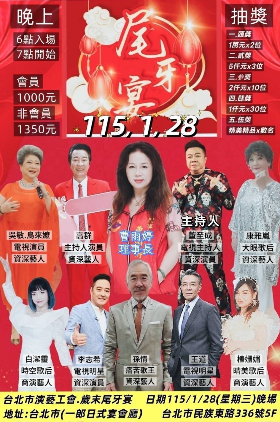 台北市演藝工會、曹育婷理事長、安排、辦馬年年度尾牙、席開宴百桌、造福資深老中青藝人、眾星雲集、讓藝人歡樂的相聚、話家常、為藝人交流、創造演藝機會